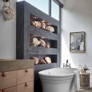 На фото: главная ванная комната в морском стиле с плоскими фасадами, светлыми деревянными фасадами, отдельно стоящей ванной, белыми стенами и бежевой столешницей