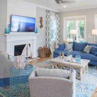 Стильный дизайн: открытая гостиная комната в морском стиле с серыми стенами, светлым паркетным полом, стандартным камином и телевизором на стене — последний тренд