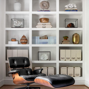Идея дизайна: кабинет в морском стиле с белыми стенами и паркетным полом среднего тона