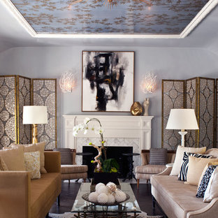 Идея дизайна: гостиная комната в стиле современная классика с синими стенами и стандартным камином