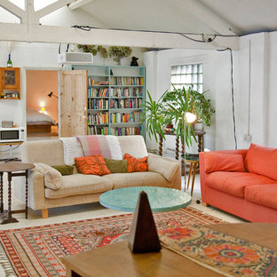Свежая идея для дизайна: открытая гостиная комната среднего размера в стиле фьюжн с белыми стенами — отличное фото интерьера